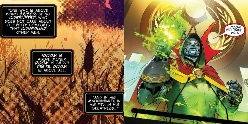 En su discurso de apertura, el doctor Doom afirma que está por encima de todos los demás líderes, ya que nunca puede ser comprado o corrompido. Se considera por encima de los vicios y tentaciones que (y habrá) hacer que otros vacilaran en sus deberes de liderazgo. Si bien esto es probable que sea cierto, el mayor problema de Doom siempre ha sido su ego, arrogancia y orgullo, lo que a menudo lleva a su propia ruina una vez que va demasiado lejos para lograr sus objetivos, cualesquiera que sean en ese momento.