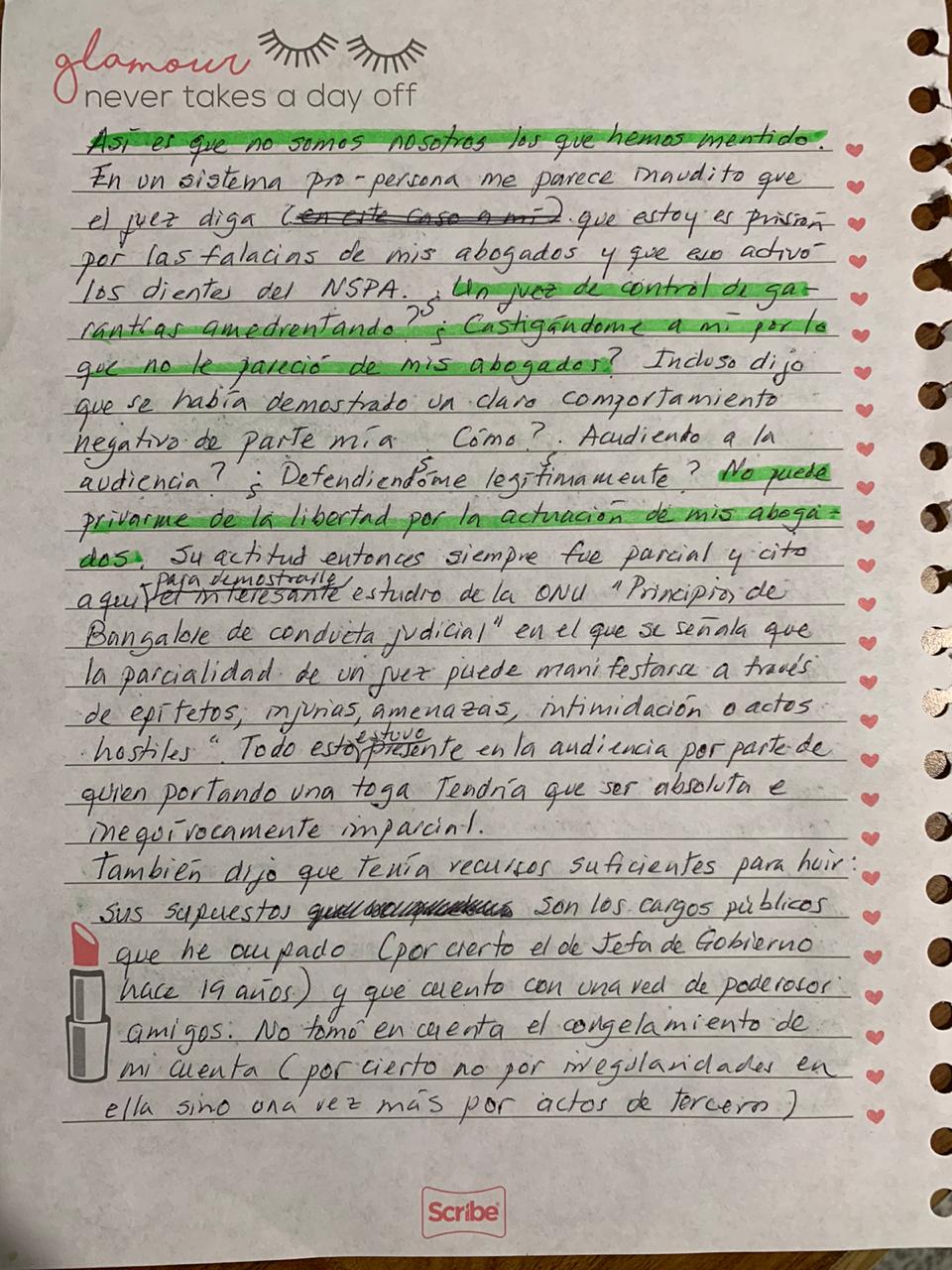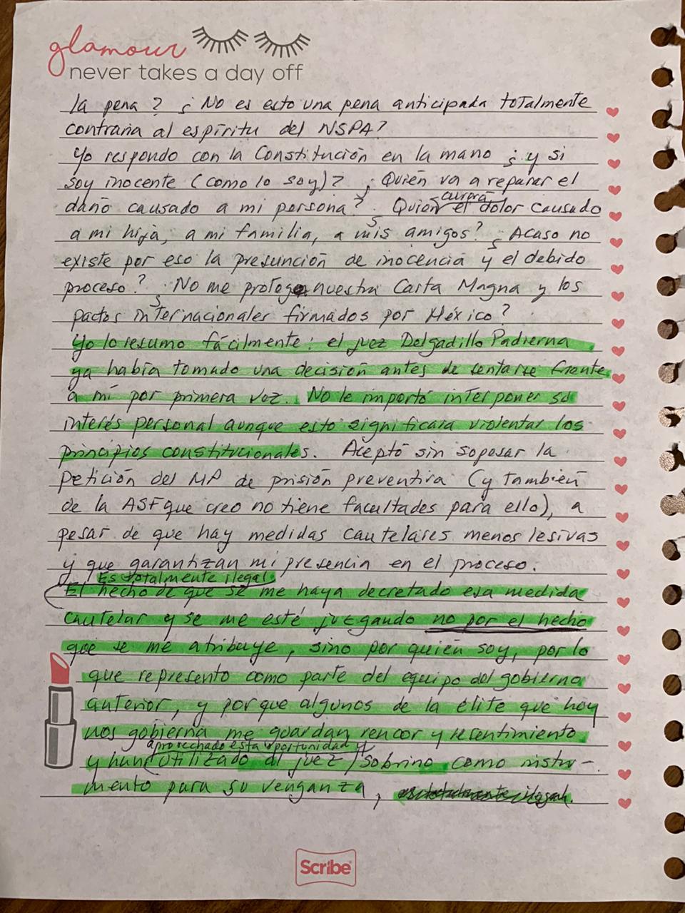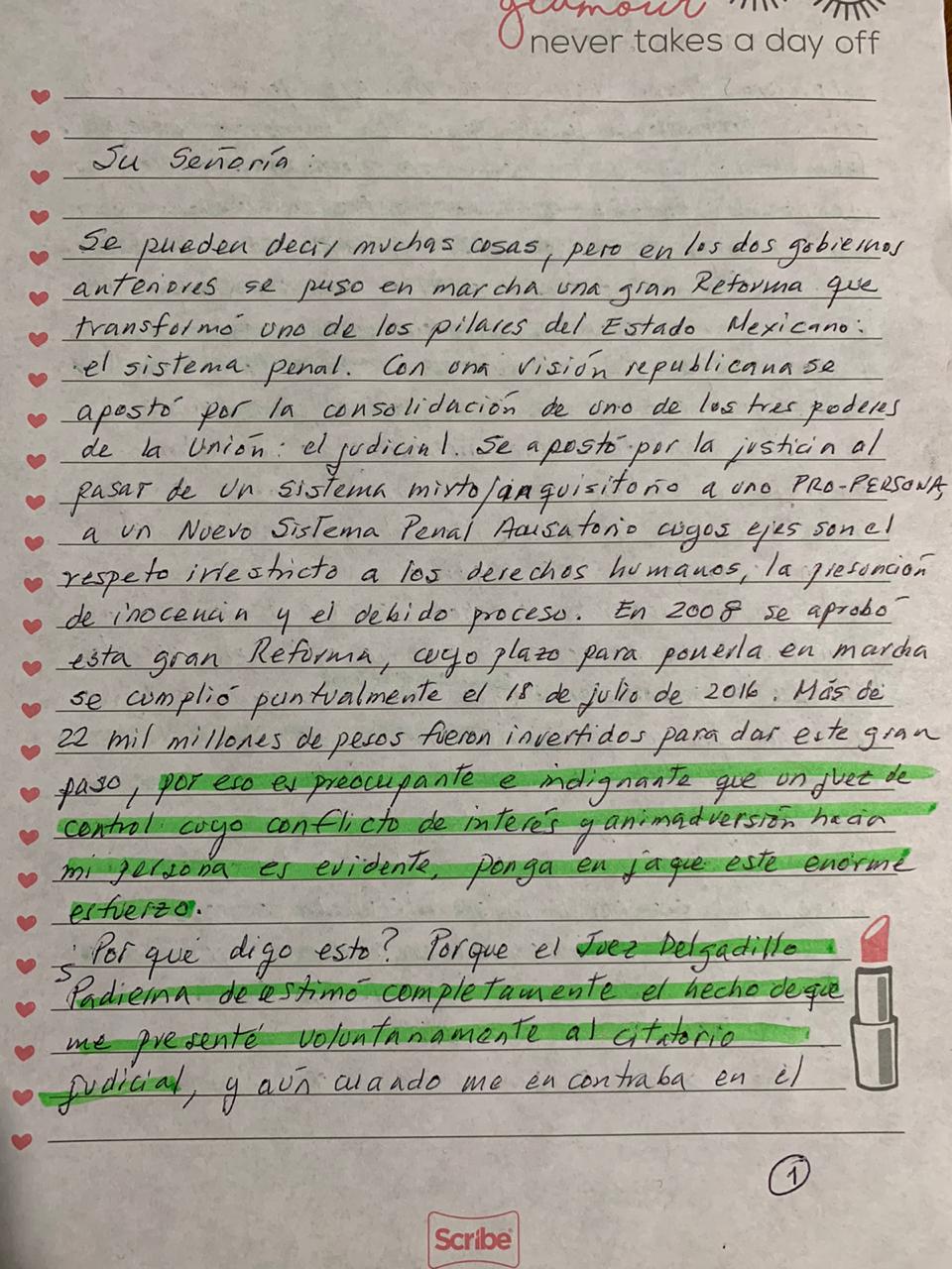 En el texto, Robles Berlanga aseveró que el juez Delgadillo ya tomó la decisión de la medida cautelar desde antes de sentarse frente a ella, porque, dijo, “no le importó interponer su interés personal aunque esto significara violentar los principios constitucionales.