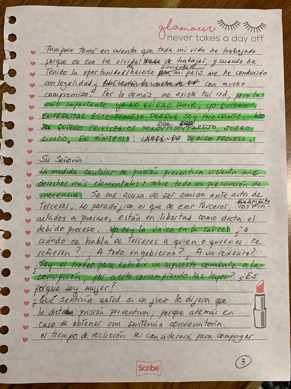 Reiteró que ella no tiene intención de huir, “yo quiero enfrentar este proceso porque soy inocente, no quiero privilegios, solo pido piso parejo, juego limpio. En síntesis, debido proceso”.