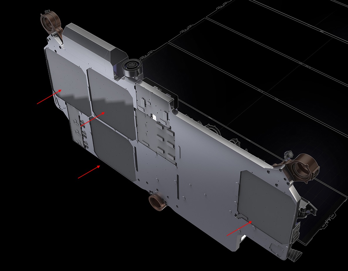 La señal proviene de y va a un conjunto de cuatro antenas de radio de “matriz en fase”. Este tipo de antena compacta y plana puede transmitir en múltiples direcciones y frecuencias sin moverse como ves grandes antenas de radar. También hay costos, pero es una obviedad para los satélites que deben ser pequeños y solo necesitan transmitir en una dirección general: hacia abajo.