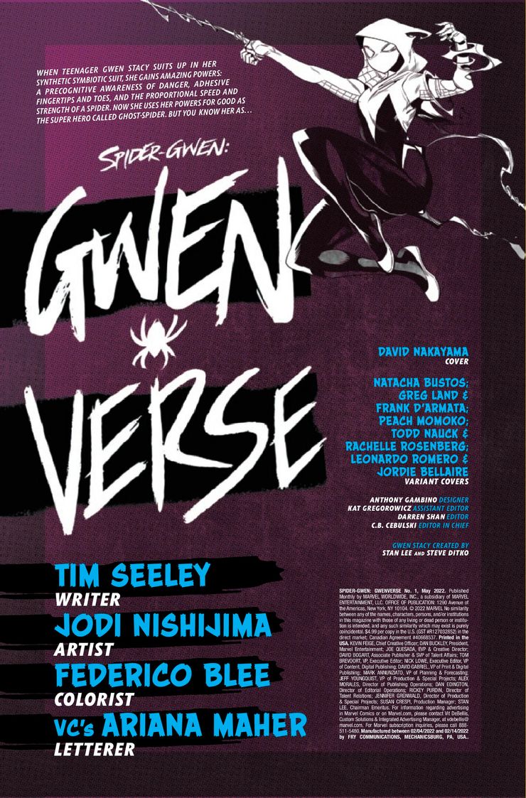 En la vista previa de Spider-Gwen: Gwenverso #1 – por Tim Seeley, Jodi Nishijima, Federico Blee y Ariana Maher – compartido por Marvel Comics, Gwen, que generalmente viaja entre su propia dimensión y el universo central de Marvel de la Tierra-616, tiene un accidente que la deja varada entre los universos. Ella es rescatada por Spider-Zero, un viajero dimensional que también es el Maestro Tejedor de la Red de la Vida y el Destino, la construcción que permite viajar entre las realidades del Multiverso. Al ver que Gwen está herida, Spider-Zero la lleva a la Tierra-65, pero al llegar descubren un mundo muy diferente al que Gwen recuerda.
