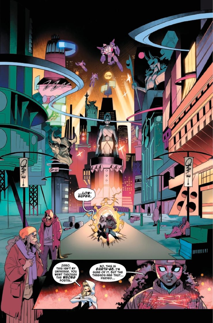 Earth-65 originalmente no era muy diferente de Earth-616, con una perspectiva y un nivel de desarrollo tecnológico similares. Sin embargo, el lugar donde terminan Gwen y Spider-Zero parece muy futurista, con robots gigantes volando en el cielo. Aún más perturbador es la cantidad de iconografía asgardiana presente. Una cabeza esculpida de Odin se encuentra en lo alto de un edificio, mientras que una estatua colosal de una versión femenina de Loki (similar a la que apareció durante Reino oscuro) domina la ciudad. En el fondo, se ven más estatuas asgardianas, lo que sugiere el hecho de que la raza de Thor controla esta versión de la Tierra. A juzgar por las miradas toscas de las personas en primer plano, esto tampoco es una utopía. Los asgardianos también se apoderaron de la Tierra-616 una vez, en una historia de Thor llamada el reinante, y los resultados fueron simplemente desastrosos. Spider-Zero menciona que los hilos de la Web o la Vida están tensos y deshilachados, lo que significa que algo ha alterado la naturaleza del Multiverso, y dependerá de Gwen y sus aliados arreglar las cosas.