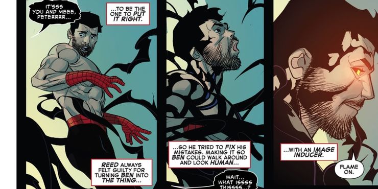 Después de que Spider-Man se deshace del simbionte, la criatura tiene una reacción similar a la del original en el sentido de que se vuelve amarga y enojada por el rechazo. El simbionte poseía a Reed Richards y usa al Sr.Fantástico para crear un ejército de simbiontes que luego se apoderan de las mentes y los cuerpos de algunos de los más poderosos de la Tierra. Si bien la reacción es extrema, todo lo que el simbionte realmente quería era que Spider-Man regresara, algo que Peter usa a su favor. Johnny Storm, también conocido como Human Torch, usa un inductor de imagen para parecerse a Peter y atrae al simbionte hacia él usando su retorcida debilidad. La Antorcha Humana se enciende y sus llamas incineran al simbionte Venom de una vez por todas.
