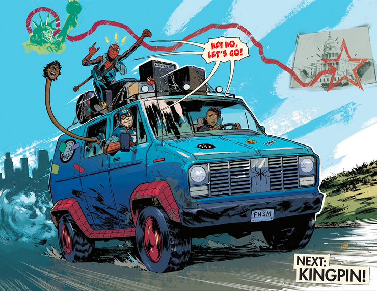 El Spider-Mobile negó uno de los aspectos más importantes de los poderes de Spider-Man: la capacidad de atravesar Manhattan a gran velocidad con sus redes. Sin embargo, el vehículo hace un gran regreso – de algún tipo – en Spider-Punk # 2, escrito por Cody Ziglar con arte de Justin Mason. En un universo alternativo donde Hobie Brown es el famoso Spider-Punk que lucha contra los villanos capitalistas con un literal banda de Vengadores, el Spider-Mobile se convierte en el Spider-Van mucho más grande.