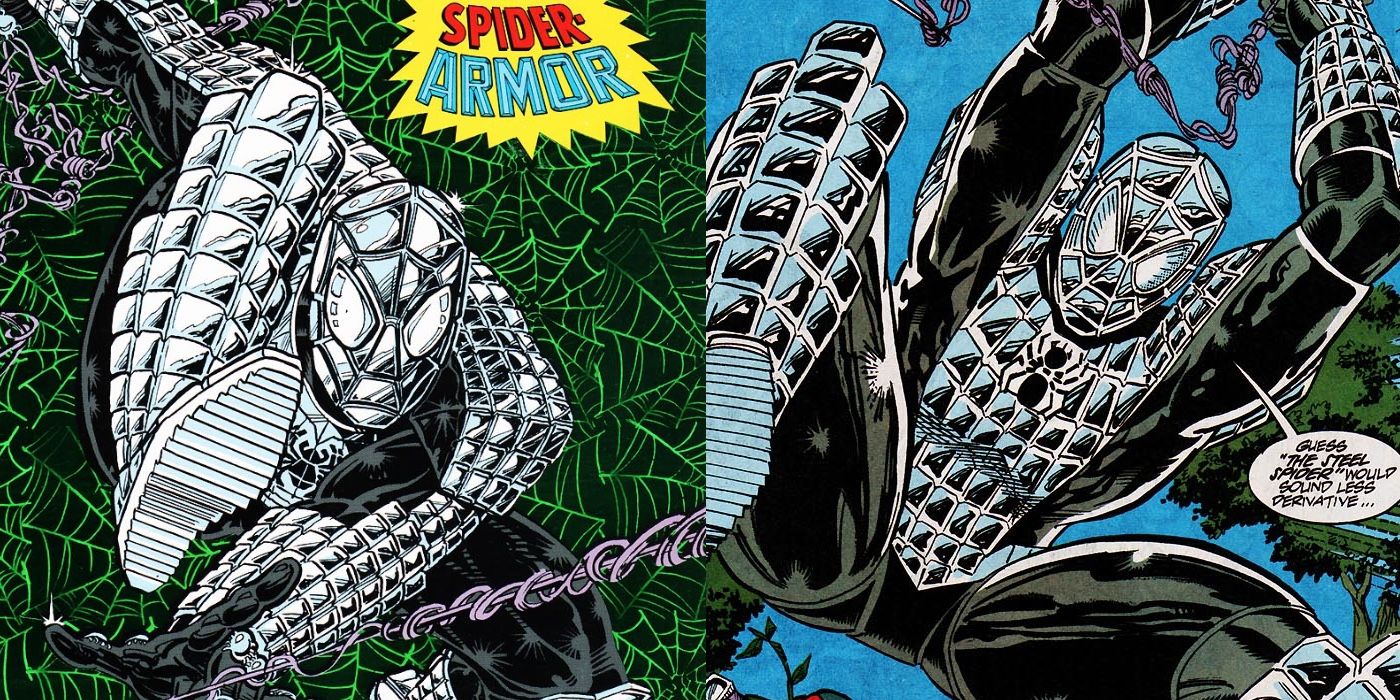 Haciendo su debut en 1993 Telaraña de Spider-Man #100, de Terry Kavanagh y Alex Savilik, Peter Parker creó esta Spider-Armor después de recibir una paliza particularmente mala por parte del equipo de villanos New Enforcers de Spider-Man. Al hacer que Spidey sea a prueba de balas y al mismo tiempo permitirle resistir la mayoría de los otros ataques con superpoderes (aunque lo ralentizó considerablemente), la armadura MK1 solo duró hasta el final del problema, cuando fue destruida después de absorber más daño del que Peter habría podido. sobrevivir si no lo hubiera usado.