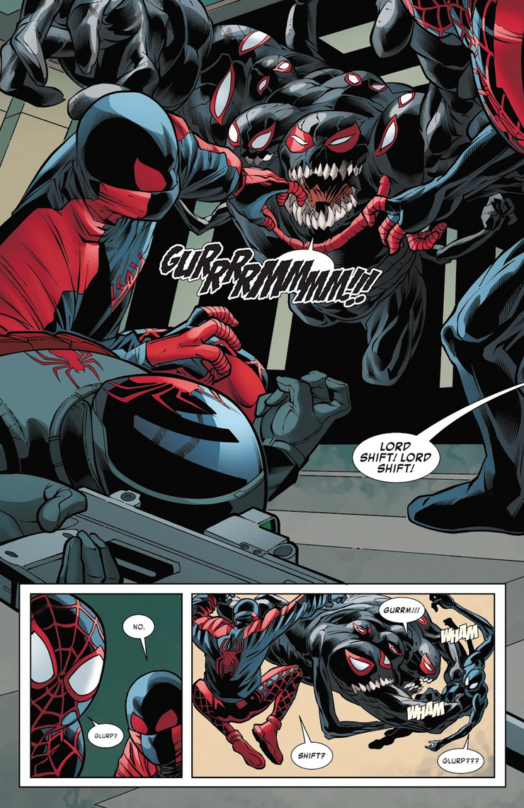 Este Shift es mucho más monstruoso que el propio hermano adoptivo de Miles, pero también se parece a otro líder de Marvel Comics: el Rey de Negro. Nada menos que el Dios de los simbiontes (de la fama de Venom), Knull, el Rey de Negro, es un villano monstruoso con una inteligencia que iguala su fuerza superior. Desafortunadamente, “Lord Shift” es derrotado después de un ataque combinado de Miles y Shift, un ataque al que el verdadero Rey de Negro nunca sucumbiría.
