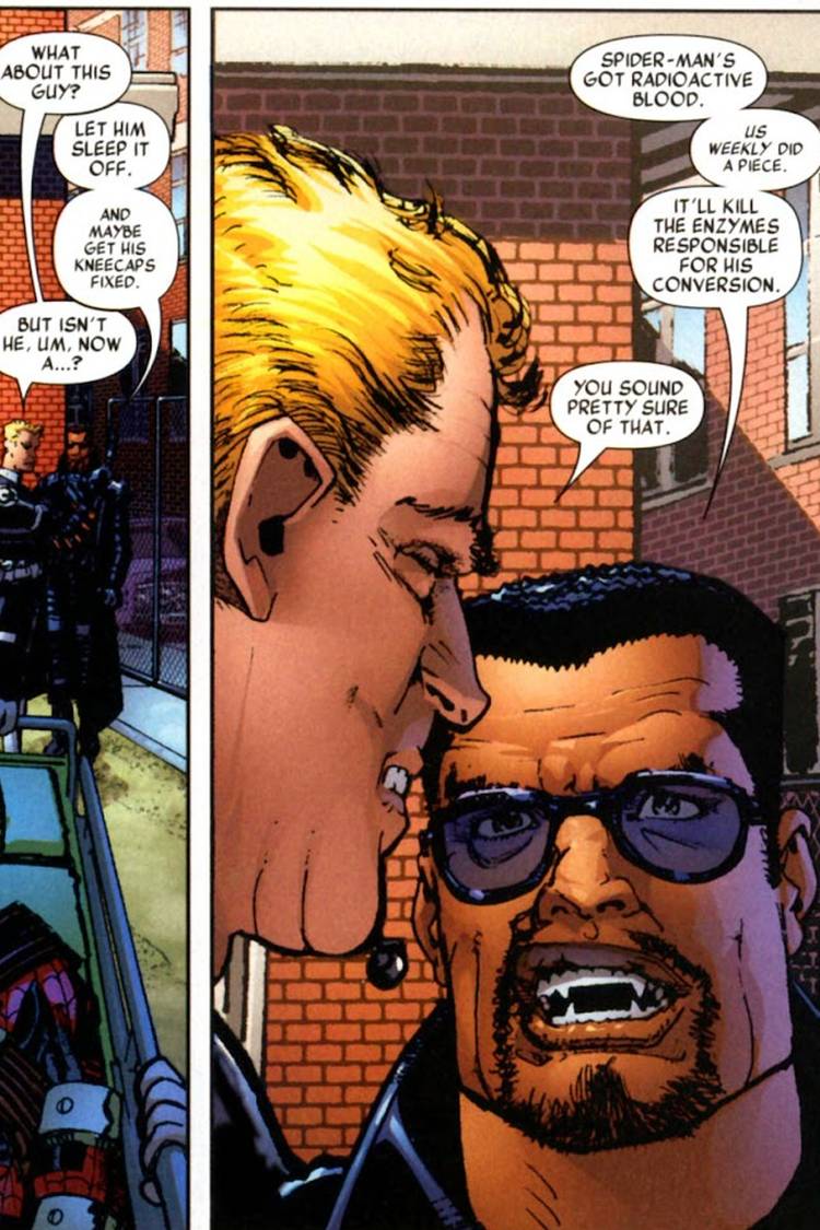 2006 Cuchilla #1, escrito por Marc Guggenheim con arte de Howard Chaykin, establece un componente vital para Spider-Man de Peter Parker que, en teoría, debería aplicarse a todas las versiones de Spider-Man en el futuro. El problema comienza con Blade luchando contra un Spider-Man atacado por un vampiro, y este último pierde la escaramuza. Mientras SHIELD elimina este último, Blade dice una línea clave.