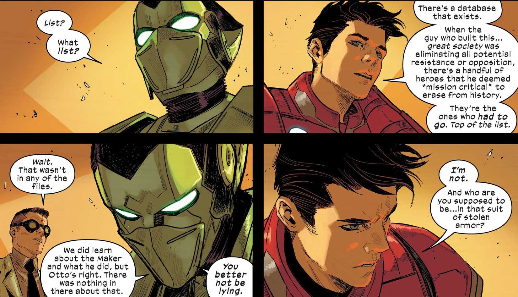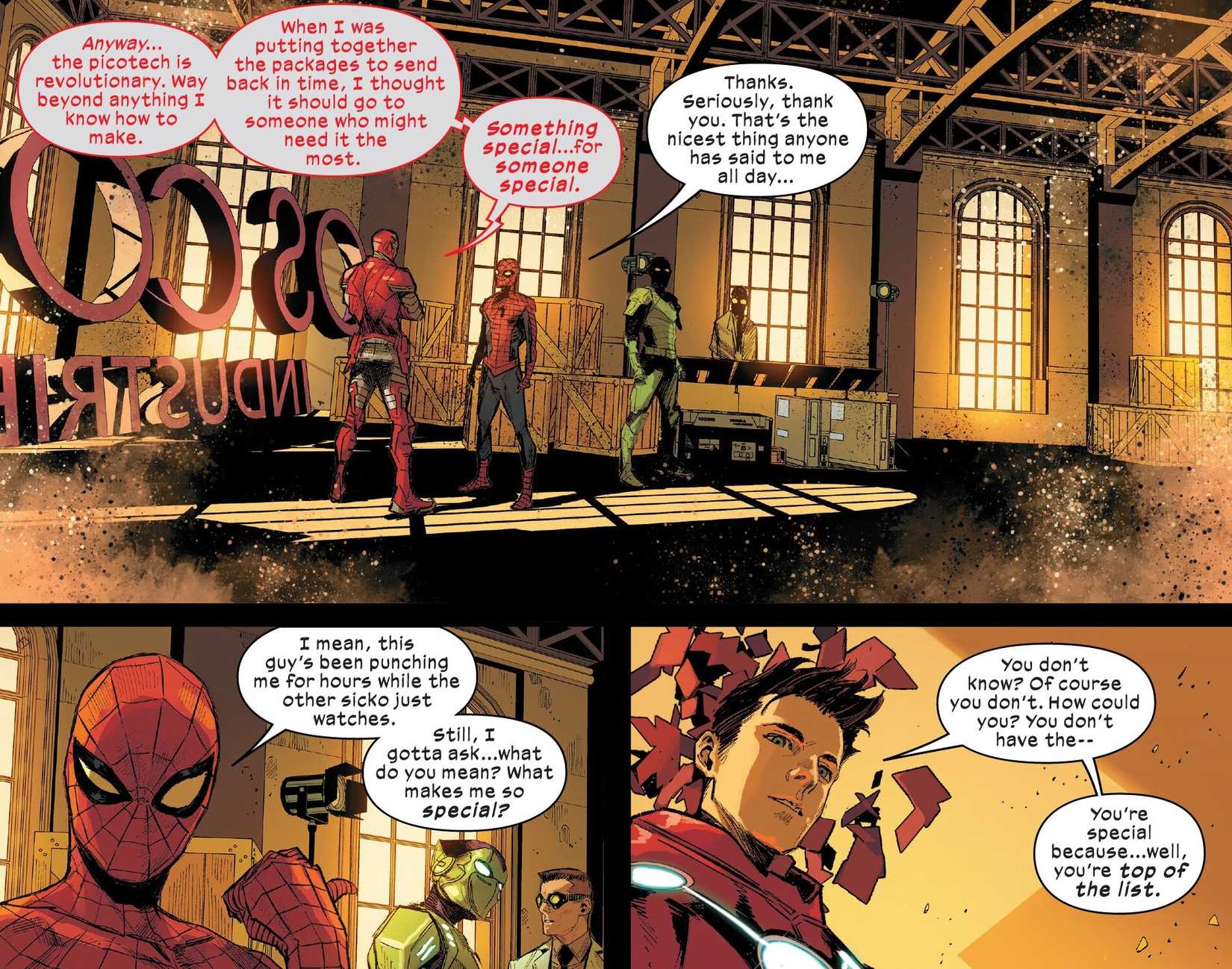 El último hombre araña El número 8 de Jonathan Hickman, Marco Checchetto, Matt Wilson y Cory Petit continúa el final del número anterior, en el que Tony Stark encuentra a Peter para comprobar su progreso para convertirse en un héroe. Durante su conversación, Peter pregunta qué lo hacía tan especial y Tony le explica a Peter por qué es el héroe más importante del Universo Marvel..