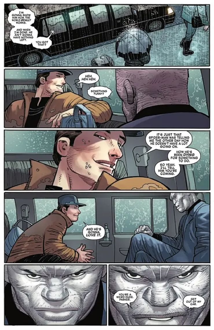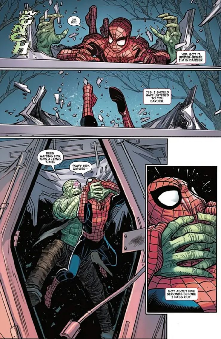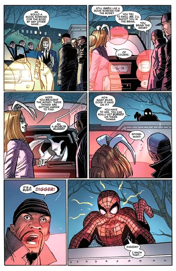 Previsualizar imágenes de El asombroso Hombre Araña n.º 1 abre con Peter vistiendo un traje rasgado en un cráter gigantesco. A medida que el lector comienza a preguntarse qué podría haber sucedido para traer a Peter aquí, la historia retrocede cuando Spidey se encuentra con Digger, un villano que John Romita Jr. co-creó. En medio de la batalla de Spider-Man con Digger, la historia cambia nuevamente a Peter Parker entrando al auto de Tombstone. Debido a que Lonnie Lincoln no conoce el alter ego de Peter Parker, pone al Web-Slinger en una excelente posición para aprender información ultrasecreta que no conocería en su personaje de superhéroe. Mucha gente solo conoce a Peter Parker como el fotógrafo de Spider-Man, si es que saben su nombre.