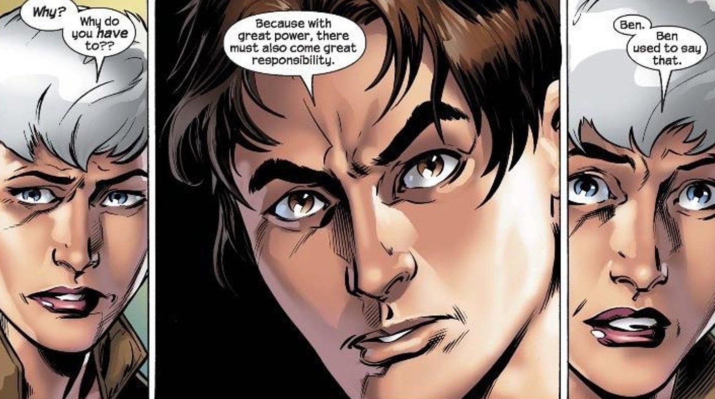 La frase apareció por primera vez en Stan Lee y Steve Ditko. Increíble fantasía #15con un panel final afirmando “Con gran poder también debe venir – ¡gran responsabilidad!” Esta línea se atribuyó más tarde al tío Ben y ha aparecido en adaptaciones como la de Sam Raimi. Hombre araña, mientras se parafrasea en casi todas las demás adaptaciones del personaje. La frase está en la mente de Peter porque, cuando la realidad se reescribió como parte de Spider-Man: El final del Spider-Verse – vivió una versión de su vida donde el tío Ben nunca murió. Ahora, arrastrado de vuelta a la realidad, Spider-Man está más comprometido que nunca con las palabras de su tío.