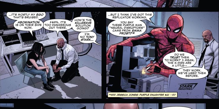Los dispositivos que los Vengadores se están preparando para usar contra el Hombre Púrpura se llaman Neural Disruptors, piezas de tecnología que los mantendrán a salvo de las aterradoras habilidades del villano. Spider-Man, sin embargo, no confía plenamente en los disruptores neuronales y dice: “¿Estás diciendo que estos ‘Disruptores Neurales’ de Purple Man vinieron de Emma Frost? ¿Confiamos en que funcionen? Quiero decir, los X-Men son un poco…En ese momento, Luke Cage lo interrumpe y le asegura que funcionarán. La falta de fe de Spider-Man en los X-Men muestra a los otros héroes que no es un Vengador de confianza. Los X-Men han demostrado ser aliados confiables a lo largo de los muchos años de continuidad de Marvel Comics y no merecen la duda de Spider-Man. Si los X-Men no se han ganado la confianza de Spider-Man, entonces todos los demás héroes corren el riesgo del escepticismo de Spider-Man, lo que demuestra que no se debe confiar en él.