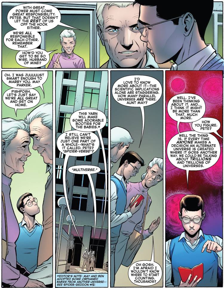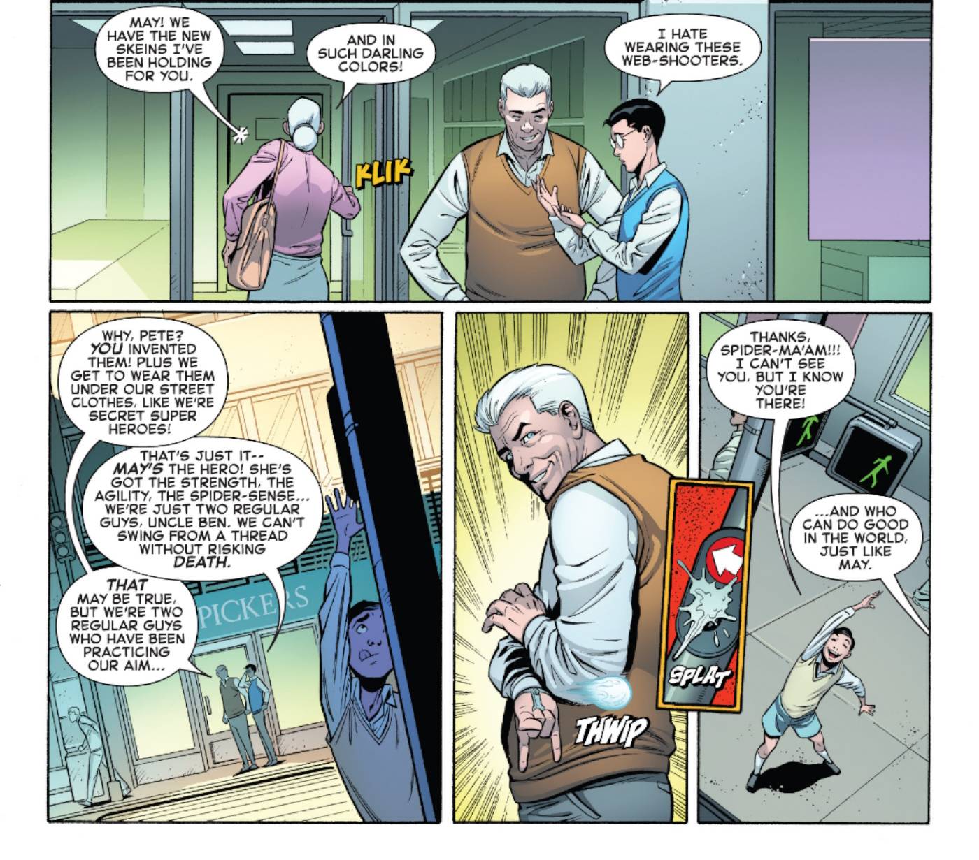 El tío Ben siempre fue un buen hombre y la tía May siempre fue una buena mujer. No necesitaban poderes para ser héroes. Acogieron a su sobrino huérfano y lo criaron con amor, brindándole la educación que eventualmente lo convirtió en un héroe por derecho propio. Esta historia demuestra que incluso sin poderes, Los dos siempre intentarán ayudar a las personas, pase lo que pase. Con el ligero cambio de que la tía May sea quien obtenga poderes de araña en lugar de Peter, muestra una dinámica familiar mucho más fuerte y una que lucha juntos por el bien común, en lugar de que Peter tenga que asumir la responsabilidad por su cuenta.