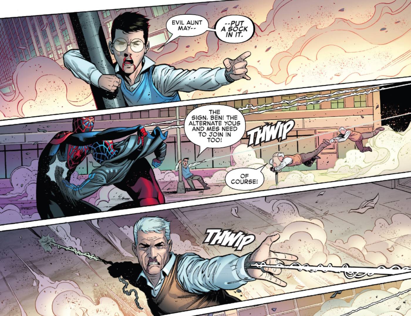 Cuando Peter Parker se convirtió Hombre araña mantuvo su identidad en secreto para proteger a su familia. Tenía miedo de que su tía May no lo entendiera o incluso no lo culpara por la muerte de Ben. Pero en un universo alternativo donde la tía May se convirtió en Spider-Ma’am, la familia Parker se convirtió en una unidad de superhéroes que lucha contra el crimen, al igual que los Cuatro Fantásticos.