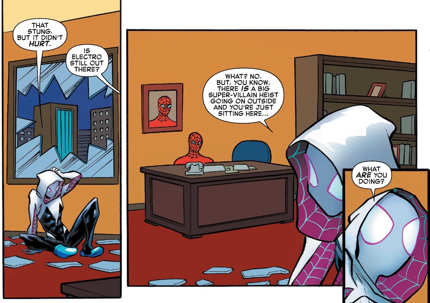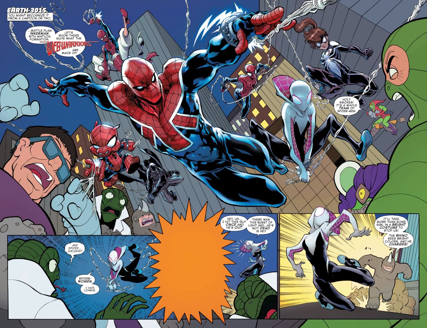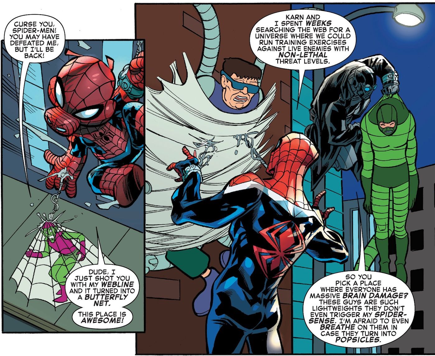 • Los Web Warriors derrotan fácilmente a los Sinister Six de los años 60 en una batalla cómica, lo que proporciona una preparación eficaz para las duras realidades del trabajo de los héroes.