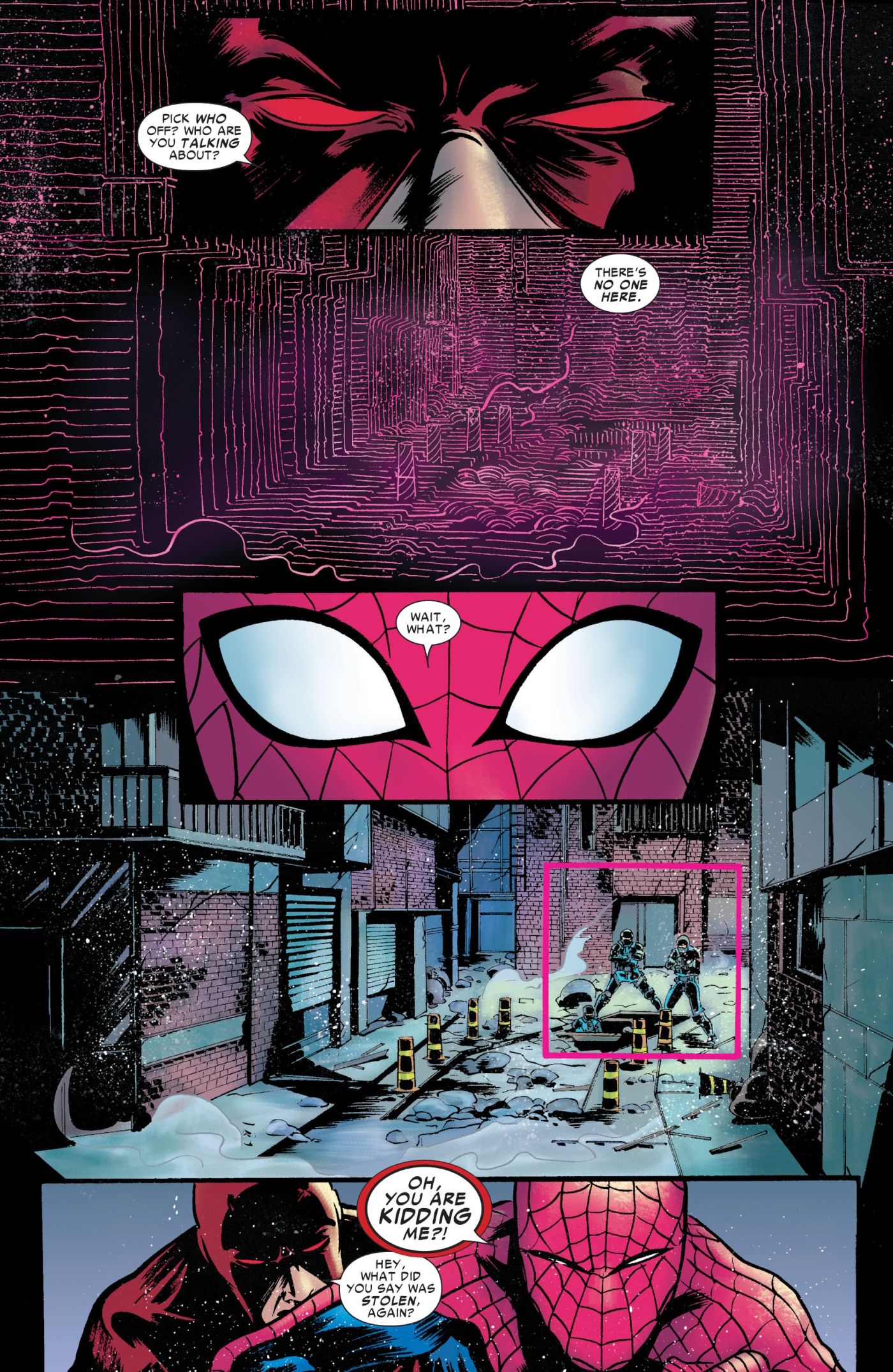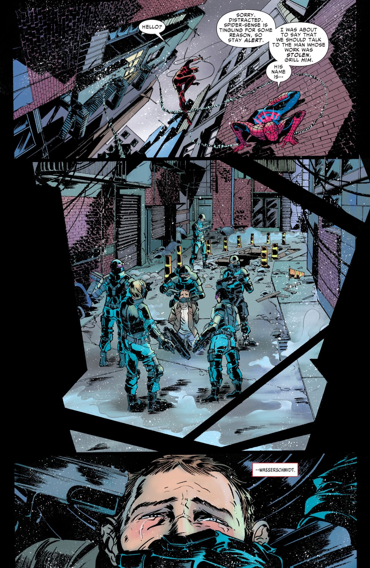 Spider-Man y Daredevil se unen para resolver un misterio en 2012 Asombroso Hombre Araña #677 de Mark Waid, Emma Ríos, Javier Rodríguez y Joe Caramagna. Un científico ha sido secuestrado y le han robado su tecnología de proyección de hologramas. Cuando Spider-Man y Daredevil localizan a los secuestradores, le ponen un arma en la cabeza al rehén.