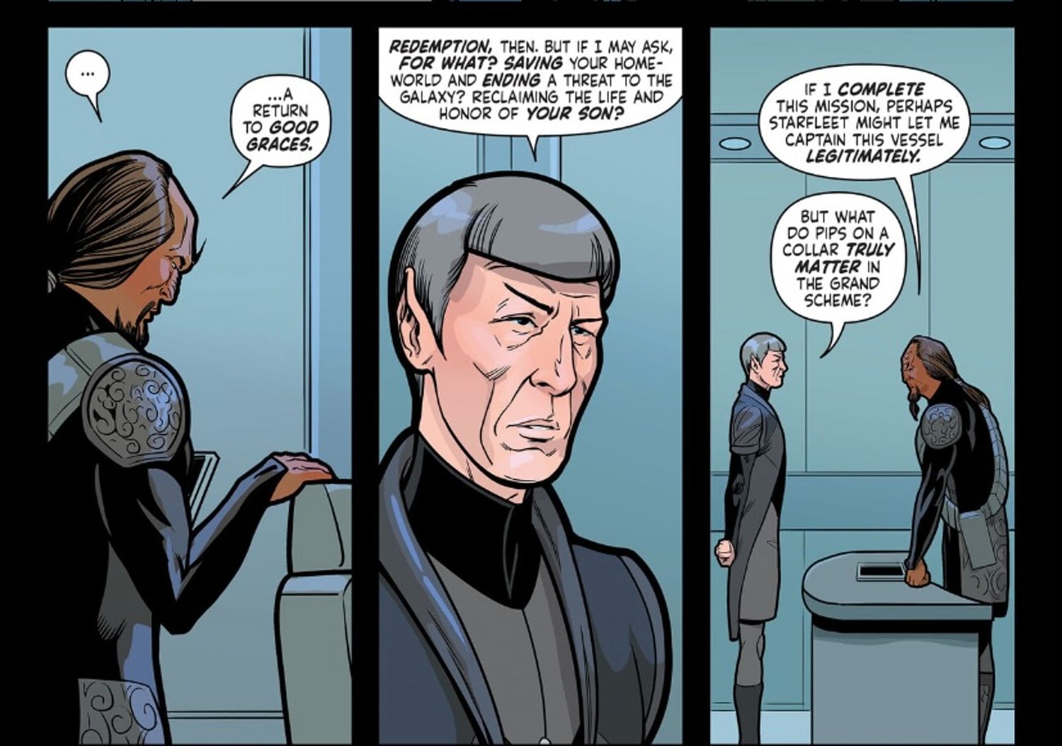 “/> “Si completo esta misión, tal vez la Flota Estelar me permita capitanear esta nave legítimamente.” dice Worf. Esto provoca la pregunta retórica de Spock, a la que sigue con su propia respuesta. “Durante mucho tiempo rechacé la capitanía, porque, sinceramente, había un hombre cuya sombra siempre supe que perseguiría. La profesión -sin importar lo que esté en juego- se volvería mezquina, impulsada por el ego.“Más allá del control vulcano de sus emociones, Lo que hace que Spock sea tan admirable es su gran capacidad para comprender sus emociones., para analizar cómo lo impulsan, o podrían conducirlo. Esto es, sobre todo, lo que siempre le ha convertido en uno de los EmigrarLos personajes más perspicaces.