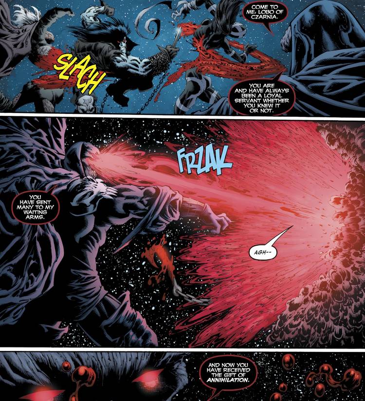 Mientras Darkseid intenta luchar contra Lobo, Lobo simplemente sigue multiplicándose e incluso logra arrancarle los ojos a Darkseid, eliminando su capacidad de usar el Efecto Omega por un tiempo.