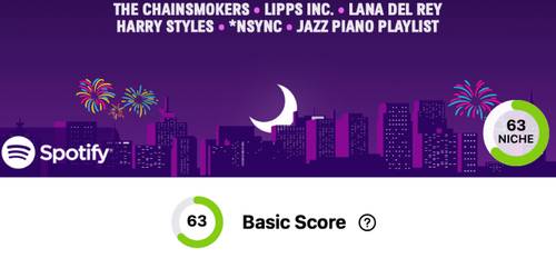 Además de crear un póster de alineación del festival, Instafest también califica el historial de escucha de una persona en Spotify con lo que llama una “puntuación básica”. La puntuación básica es una calificación entre 1 y 100, y se basa en cómo es la alineación de música del festival de una persona. Una puntuación baja indica que la alineación del festival de una persona consiste en principalmente artistas de nicho, mientras que una puntuación alta significa que su alineación incluye artistas más populares.
