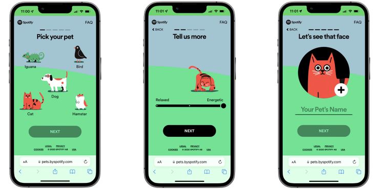 Para comenzar a hacer una lista de reproducción de mascotas de Spotify, debe visitar el sitio web de listas de reproducción de mascotas en su teléfono o computadora y hacer clic en el botón ‘Vamos’ para iniciar sesión con su cuenta de Spotify. Una vez que estás dentro, Spotify te pide que elijas a tu mascota. Puedes elegir un perro, un gato, un pájaro, un hámster o una iguana. Elija la mascota que tiene, haga clic en ‘Siguiente’ y luego arrastre el control deslizante en la página siguiente para indicar el nivel de energía de su mascota. Mueva el control deslizante hacia la izquierda si su mascota está relajada, muévalo hacia la derecha si tiene mucha energía o coloque el control deslizante en cualquier lugar en el medio para que coincida mejor con la personalidad de su mascota.