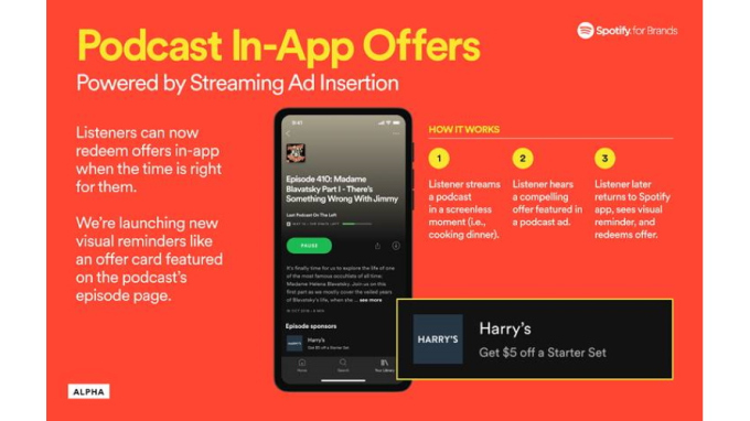 Spotify está probando un nuevo formato de anuncio más interactivo diseñado para podcasts: la oferta en la aplicación. En lugar de pedir a los oyentes que recuerden un código de cupón o visiten una dirección de sitio web específica, la oferta en la aplicación permite a los usuarios canjear una oferta en el momento que les sea conveniente. Esto se realiza mediante un recordatorio visual dentro de la aplicación Spotify que muestra los patrocinadores en la página del episodio de podcast.