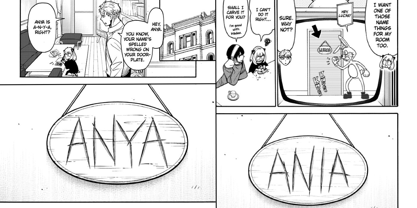 Misión corta 11 de Espía x familia confirma El nombre de Anya aparece de manera inconsistente simplemente porque no sabe cómo escribir su nombre. y muchas veces se equivoca. En el especial, Anya talla la placa que a menudo se ve colgada en su puerta, deletreando su nombre como “ania.” En algún momento después, Loid señala el error y le dice a Anya cómo se escribe realmente su nombre, después de lo cual Anya arregla la placa de identificación.