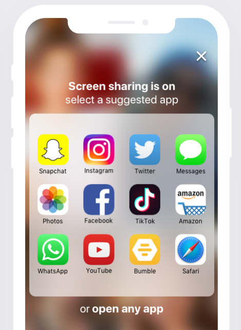 Squad trabajó, gracias a una forma elegante de activar el uso compartido de pantalla. La aplicación se lanza a la cámara selfie similar a Snapchat, pero con un botón + para invitar a amigos a una llamada de video. Toque el botón de compartir pantalla en la parte inferior, seleccione Escuadrón e inicie la transmisión. Para guiar a los usuarios hacia las mejores experiencias de uso compartido de pantallas, surge un menú de aplicaciones que animan a los usuarios a abrir Instagram, TikTok, Bumble, su rollo de cámara y otros.