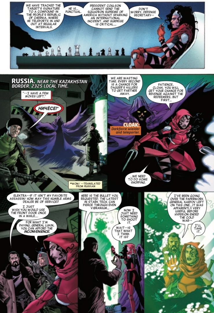 - Hay algunas amenazas que requieren un enfoque más salvaje que el que puede ofrecer el Escuadrón Supremo de América. Para esas misiones, el Departamento de Defensa ha reunido un equipo formado por Elektra, Punisher, Crossbones, Cloak y el enigmático Murder Hornet. Deben abrirse camino a través de un equipo de terroristas superpoderosos conocidos como los Redentores, ¡si no se matan entre ellos primero! ¡Prepárate para giros, vueltas, dobles cruces y mucha acción!