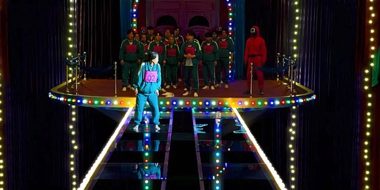 Juego de calamar sigue a un grupo de personas que participan en una serie de juegos infantiles de vida o muerte para aliviar su deuda financiera extrema. El quinto juego de la serie muestra a los concursantes moviéndose a través de un puente de vidrio ancho de dos paneles, uno de los cuales se romperá bajo su peso y otro que los sostendrá, lo que provocará la muerte de varios personajes importantes. La secuencia requirió mucho trabajo de acrobacias por parte del Juego de calamar equipo.
