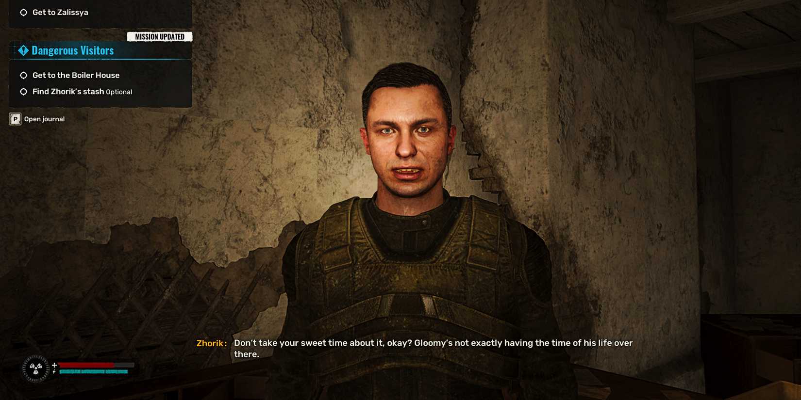 En este punto, el jugador no tiene idea de quiénes son Zhorik y Gloomy, y acaban de descubrir los peligros de confiar en sus compañeros Stalkers, una lección que aprendieron de la manera más difícil. Es posible que se muestren reacios a aceptar la oferta de Zhorik.o confíe en su palabra al pie de la letra. Zhorik tampoco promete mucho, sólo cualquier botín que puedan encontrar en el camino. También les está confiando bastante equipo útil (kits médicos, munición, etc.) que sería mejor que conservaran. En caso de que la fatiga por tomar decisiones los esté carcomiendo, así es como “Visitantes peligrosos“La misión secundaria funciona.