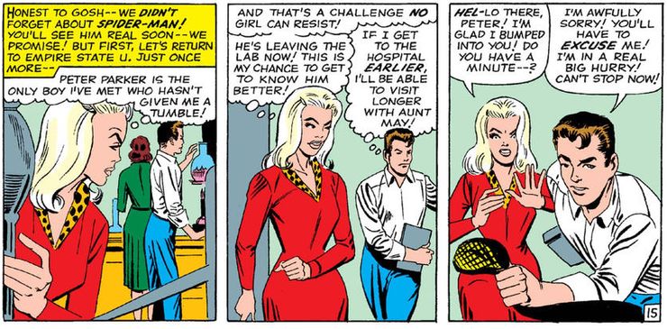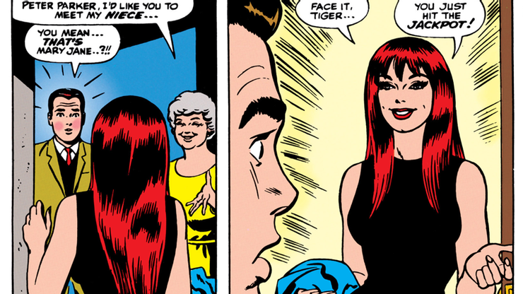 Por el contrario, Mary Jane fue presentada como una broma. Como broma corriente, la tía May intentaba constantemente poner a Peter con Mary Jane, que vivía al lado. Peter (y los lectores) asumieron que cualquier persona con el sello de aprobación de la tía May debe ser un personaje aburrido, sencillo y pasado de los tiempos, pero el panel ahora famoso del final de Amazing Spider-Man # 42 en 1966 mostró la conmoción de Peter cuando Mary Jane reveló su rostro por primera vez. “Acéptalo, Tiger – ¡acabas de ganar el premio gordo!” ella dice; Stan Lee aún no lo sabía, pero este momento fue el principio del fin para Peter y Gwen. En el plan original de Stan Lee, Mary Jane era servir como “la otra mujer” con la que Peter saldría durante algún tiempo antes de darse cuenta de que Gwen Stacy era la persona con la que quería pasar el resto de su vida. Para facilitar la trama, MJ se convirtió en una “chica mod” vivaz y de moda que contrastaba directamente con Gwen Stacy.