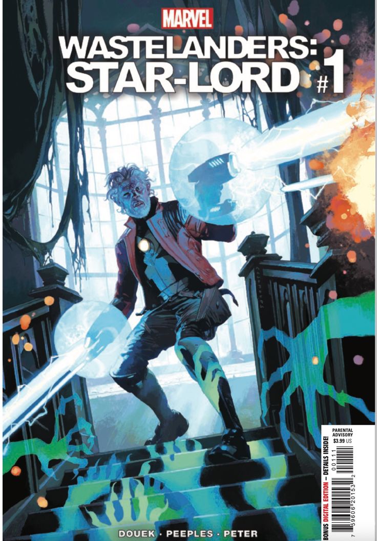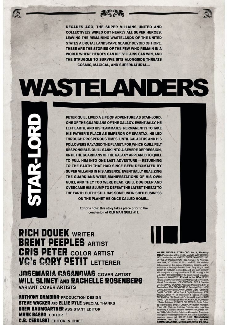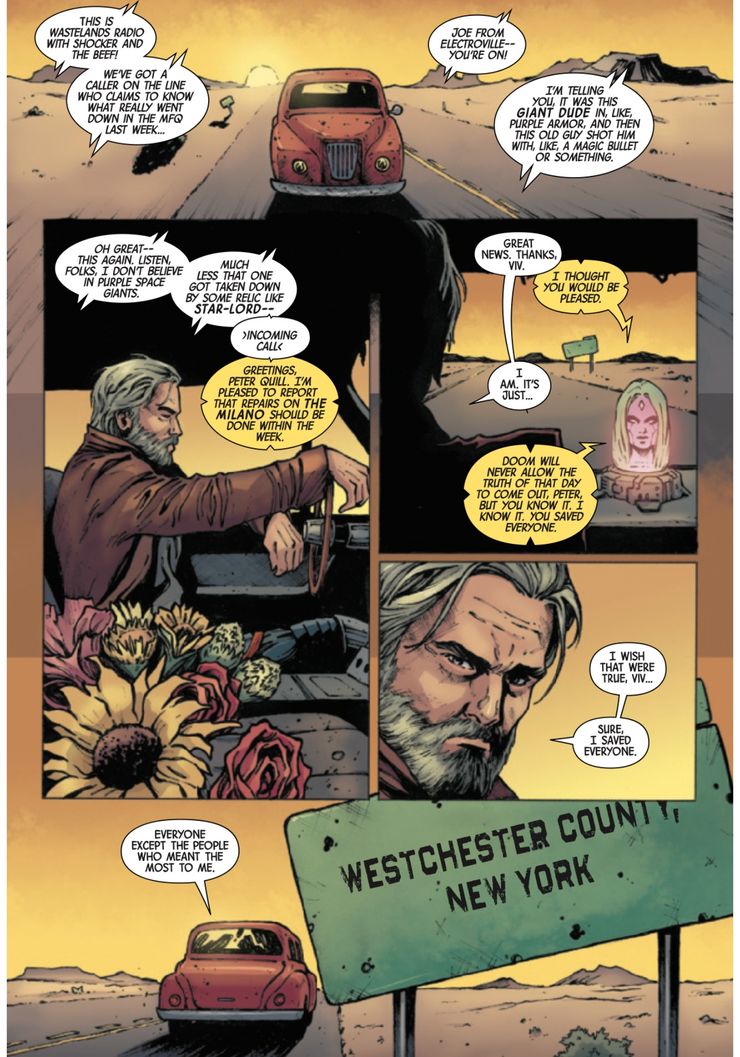 En una nueva vista previa de Wastelanders: Star-Lord # 1 por Rick Douek, Brent Peeples, Cris Peter y Cory Petit de VC, se ve a Peter Quill conduciendo en la Tierra, escuchando Wastelands Radio. Los locutores de radio reciben una llamada sobre el incidente de la semana anterior (la muerte de Galactus), y la persona que llama les dice que un “tipo gigante” con armadura púrpura cayó sobre un viejo con una “bala mágica”. Uno de los locutores de radio responde diciéndole a la persona que llama que no “cree en los gigantes espaciales violetas”, especialmente en aquellos que podrían ser derrotados por una “reliquia” como Star-Lord.