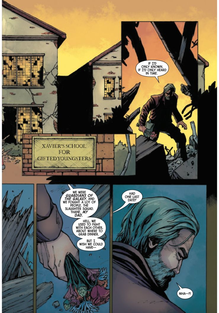 Star-Lord termina visitando una Escuela Xavier destruida para jóvenes dotados, donde se lamenta de su tiempo con Kitty Pryde cuando una voz lo interrumpe después de decirle que desearía haber tenido más tiempo con ella.