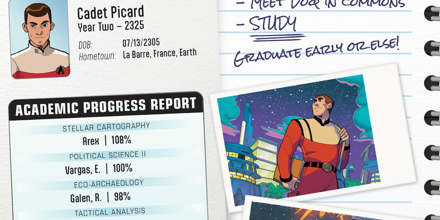 Star Trek: La Academia de Picard El número 1, escrito por Sam Maggs, dibujado por Ornella Greco, coloreado por Charlie Kirchoff y escrito por Jeff Eckleberry, comienza con una página que presenta el Informe de progreso académico de Jean-Luc Picard en la Academia de la Flota Estelar.