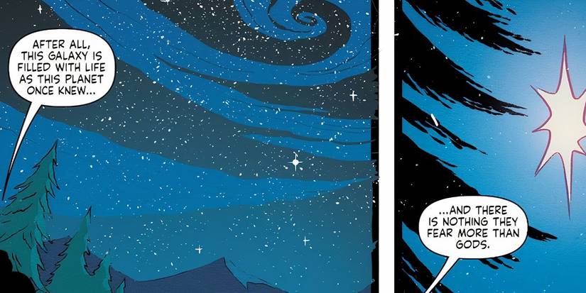 El número 19 profundiza en el miedo y el misterio que rodean a los seres divinos en el universo, explorando el impacto que tienen en los mortales. - La historia enfatiza la importancia de que los dioses permanezcan ocultos para evitar incitar al miedo y la agresión de formas de vida inferiores.