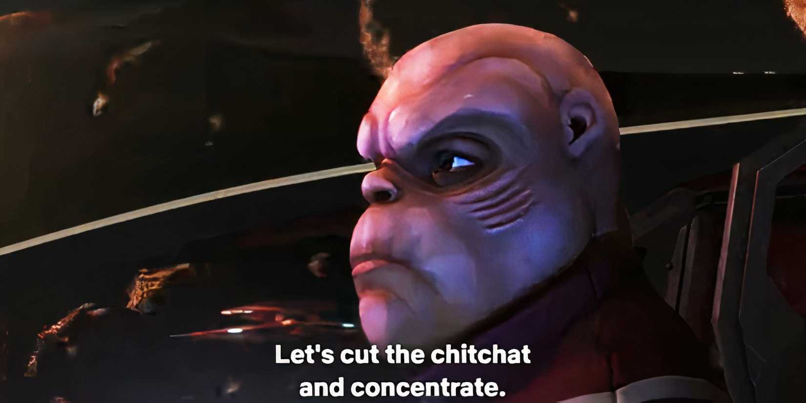 Star Trek: Prodigio Temporada 2, episodio 15, “Ascensión, Parte I” continúa Star Trek: Espacio profundo nueveEl chiste de la mañana de ‘s de una manera brillante. Al comienzo del episodio, prodigio‘El escuadrón Nova está practicando maniobras de vuelo en la impresionante nueva sala de hologramas del USS Voyager-A. Mientras se preparan para realizar la increíblemente difícil maniobra de supernova de Boothby, Zeph (Sukrish Bala) reprende a su compañero de equipo luriano por “Deja de parlotear y concéntrate“a lo que Grom simplemente responde con un gruñido. El chiste funciona de manera brillante porque, como con Morn en DS9, prodigioLos espectadores no han visto a Grom pronunciar una sola palabra en los 14 episodios anteriores.