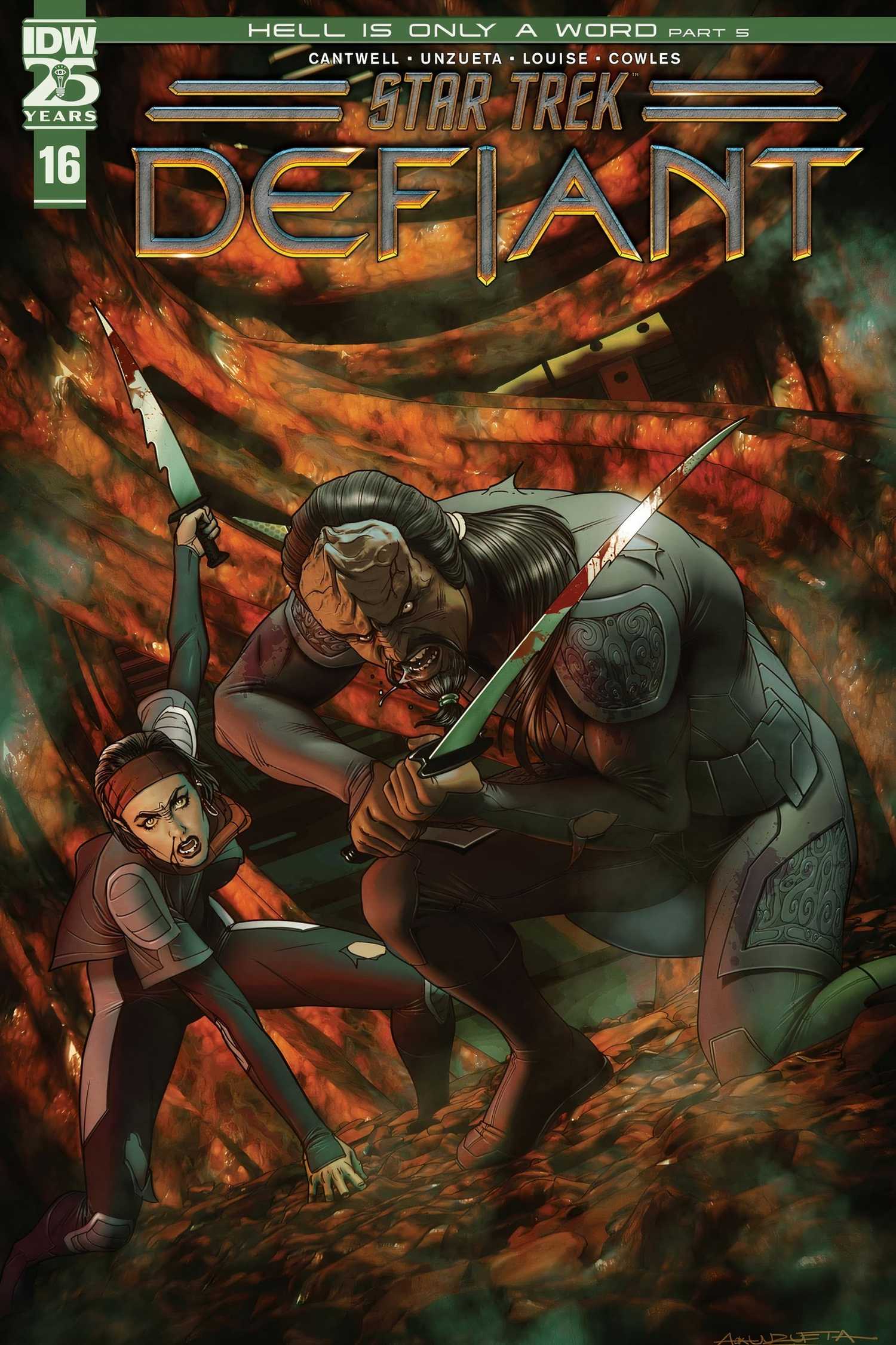 Star Trek: Desafiante El número 16, quinta parte de “El infierno es solo una palabra”, está escrito por Christopher Cantwell y dibujado por Angel Unzueta. A raíz de un intento de fusión mental con los parásitos de “Conspiración”, la mente de Spock ha sido tomada. Está en comunicación con la mente colmena del parásito, pero no puede actuar. Frustrada, Sela intenta sacar a Spock de su trance. Ella le grita que su “falsa modestia” es su debilidad.