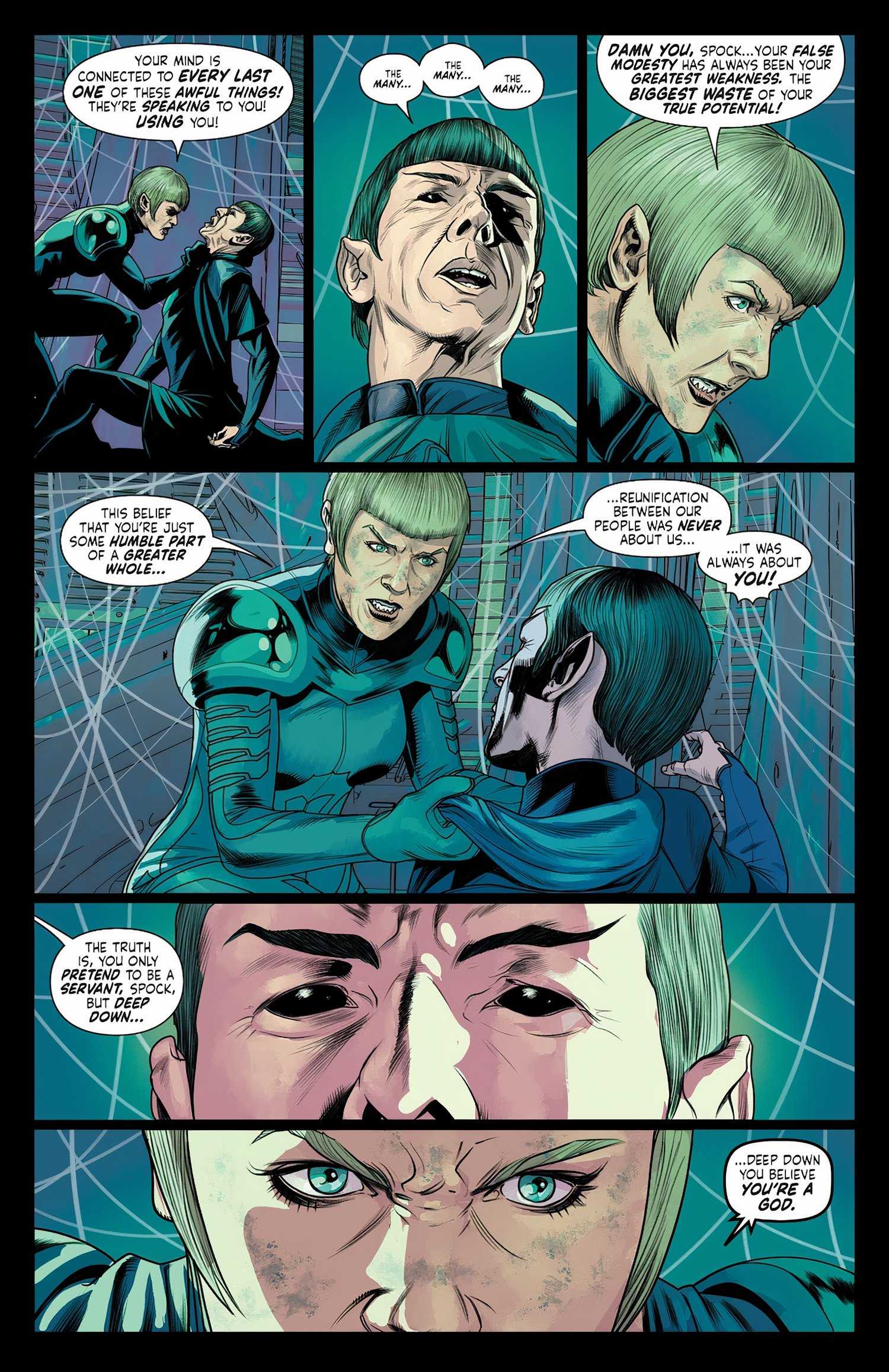 Sela, invocando los intentos de reunificación de Spock, dice que Spock sólo “finge” ser un sirviente, pero de hecho se cree un dios.