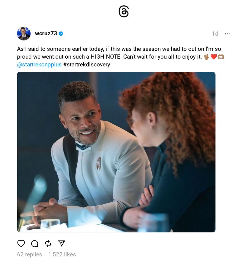 En respuesta a Star Trek: Descubrimiento En el lanzamiento del tráiler de la temporada 5 por parte de Paramount+, Wilson Cruz publicó una foto promocional en Threads de sí mismo como el Dr. Hugh Culber hablando con la teniente Sylvia Tilly de Mary Wiseman. Cruz dice lo orgulloso que está de Star Trek: Descubrimiento temporada 5 porque la serie va a salir en tal “NOTA ALTA.” Consulte la publicación del hilo de Wilson a continuación: