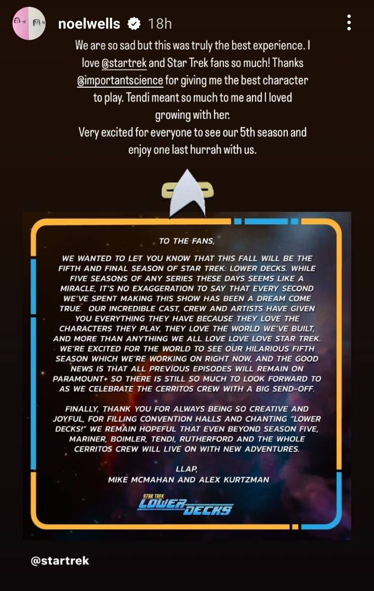 En sus Historias de Instagram, Noël Wells (@noelwells) compartió la declaración de Star Trek: cubiertas inferiores creador y showrunner Mike McMahan y Star Trek El productor ejecutivo Alex Kurtzman marca la última temporada de Star TrekLa primera comedia animada y agradeciendo a los fans. Wells agregó sus más sentidas palabras agradeciendo a McMahan por el personaje de D’Vana Tendi. y esperando que el público disfrute “un último hurra” con el USS Cerritos en Star Trek: cubiertas inferiores temporada 5. Mira su publicación a continuación: