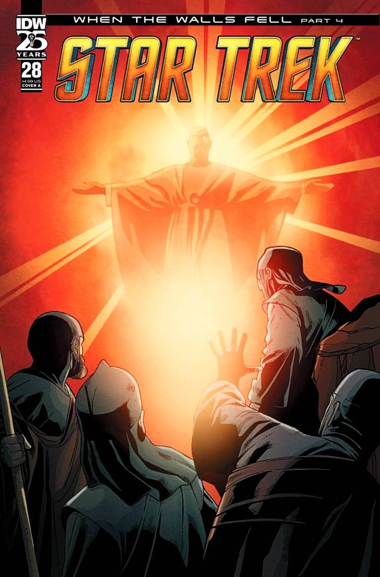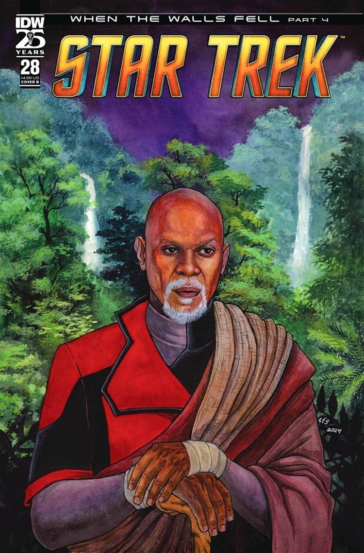 viaje a las estrellas #28 – escrito por Collin Kelly y Jackson Lanzing, con arte de Tessa Fowler – encuentra al Capitán Sisko retrocedido en el tiempo, hasta “un bajor de la edad de bronce,” dejando que la población indígena se pregunte si él es “una amenaza aterradora o el profeta que estaban esperando“.