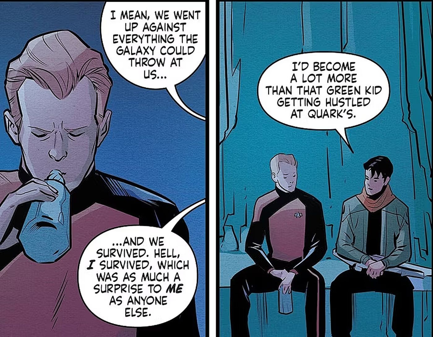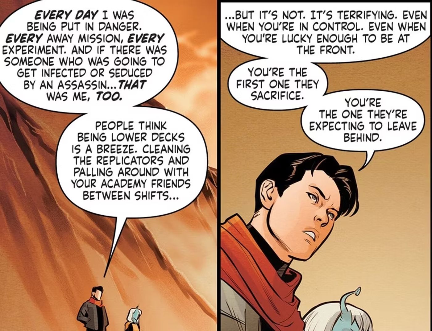 Harry Kim comprende los peligros de la Flota Estelar, especialmente los de rango inferior, de manera más aguda que la mayoría. En Star Trek #13, él y su viejo amigo Tom Paris comparten un momento de reflexión. “Sobrevivimos… diablos, yo sobreviví.“, dice Harry, aunque técnicamente esto no es cierto. Como Emigrar Los fanáticos recordarán, el Viajero El episodio “Deadlock” de la segunda temporada presentó un momento impactante en el que Harry fue succionado al espacio a través de una brecha en el casco, muriendo horriblemente frente al Capitán Janeway. Aunque el episodio concluyó con un duplicado de Harry tomando su lugar, el original, de hecho, murió en el Cuadrante Delta.