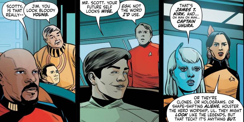 viaje a las estrellas #26, la segunda parte de la historia de “Cuando cayeron los muros”, está escrita por Jackson Lanzing y Collin Kelly y dibujada por Ángel Hernández. Después de escapar del Espacio Fluidico, el Capitán Sisko y el Teseo se encuentran en el Universo Kelvin, de la película reiniciada de JJ Abrams de 2009. Son recibidos por el Empresay cuando el Teseo La tripulación abre frecuencias de llamada, el alférez Sato ve a Uhura en el puente. Asombrado, Sato la llama “Capitán Uhura”.