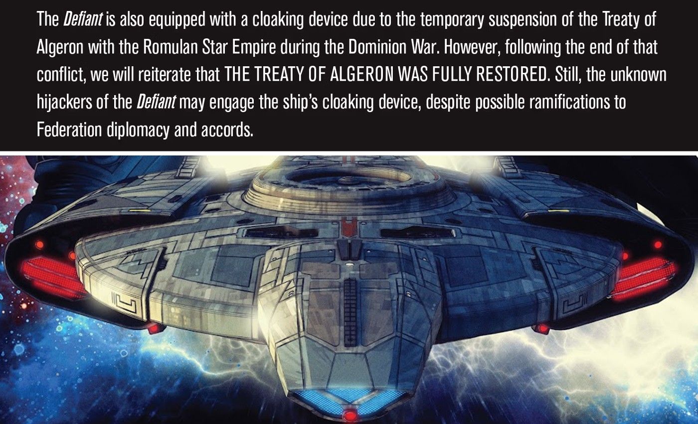 Pero ahora, con la amenaza del Dominio en el espejo retrovisor, el Tratado de Algernon ha sido restablecido, haciendo que el dispositivo de encubrimiento sea ilegal nuevamente. Todas las naves de la Federación cumplen con esta regla, pero es casi seguro que las Desafiante‘s la tripulación no lo hará. El Tratado se suspendió inicialmente durante la preparación de la Guerra del Dominio, en la que la Flota Estelar y la Federación tuvieron que tomar algunas decisiones realmente difíciles. La llegada del Dominio requería medidas extremas y, por lo tanto, el Desafiante tiene su dispositivo de camuflaje. Una vez más, la galaxia se encuentra en una encrucijada: si Kahless y Red Path tienen éxito en su búsqueda, podría significar el fin de la realidad. Con lo que está en juego incluso más que el Dominio, tiene sentido que Worf elija usar el dispositivo una vez más, a pesar de que esto podría romper el Tratado de Algernon y arriesgar la guerra con el Imperio Romulano.