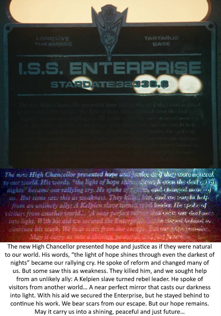 - La placa dedicatoria en la nave espacial arroja luz sobre los acontecimientos de finales del siglo XXIII después de “Mirror, Mirror” de la temporada 2 de TOS.