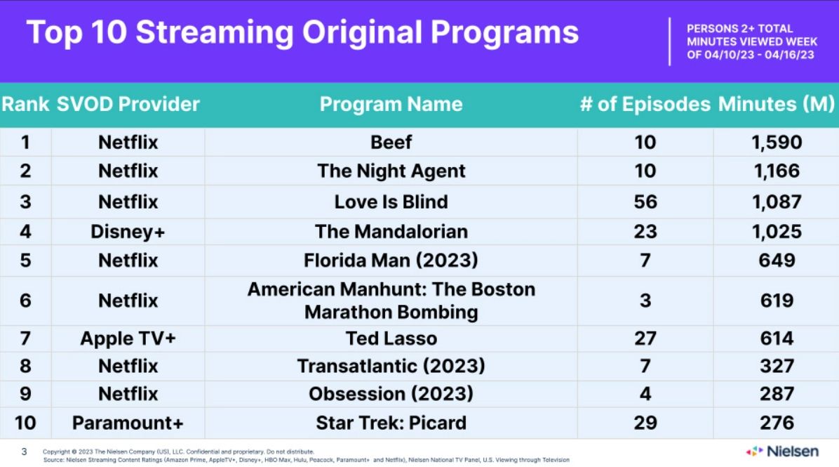 En un campo dominado por Netflix, Viaje a las estrellas: Picard es el único programa de Paramount+ que se clasificó para el período del 10 al 16 de abril, aterrizando en el puesto número 10. Picardo ocupó el puesto número 9 en la tabla anterior publicada por Nielsen, que cubría hasta el episodio 4, “No Win Scenario”.
