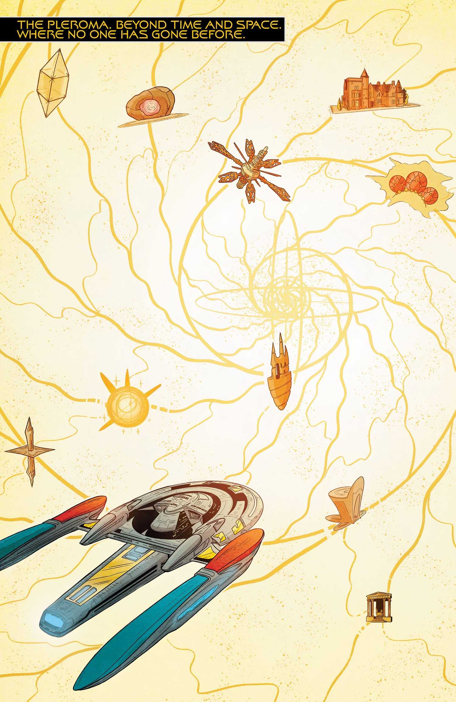Sisko y el Teseo La tripulación ingresa al Pleroma en una de las secuencias más alucinantes jamás vistas en un Star Trek cómic. Lo surrealista quedó a la vista cuando la tripulación vio el Pleroma, probablemente por primera vez con ojos mortales. La espiral gigante y las casas que se vieron flotando en ella agregaron una capa aún más de rareza. Entre las “casas” que vieron Sisko y compañía se encontraban la Guardiana de la eternidad, la Guardián (de Star Trek: Voyager), la casa de Trelane y el templo de Apolo, entre otros. Sin duda, se revelarán más en los próximos meses.
