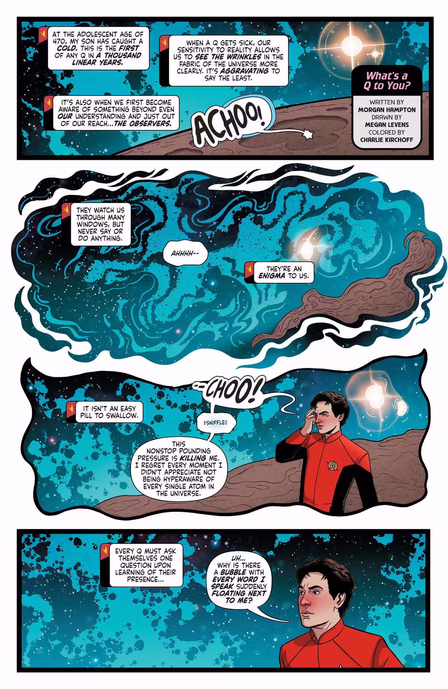 Sin embargo, como se ve en “¿Qué es una Q para ti?” viaje a las estrellas La franquicia y las preocupaciones meta se combinan bien. Morgan Hampton y Megan Levens aprovechan al máximo las posibilidades que ofrece el medio del cómic. Q Jr juega regularmente con los globos de diálogo, retorciéndolos y tirándolos por todos lados. Q Jr también intenta manipular el esquema de colores, pero su fracaso en hacerlo finalmente lo lleva a aceptar las lecciones que su padre está tratando de enseñarle. Hampton y Levens crearon un excelente metatexto. viaje a las estrellas historia y defendió la necesidad de realizar más intentos en el futuro.
