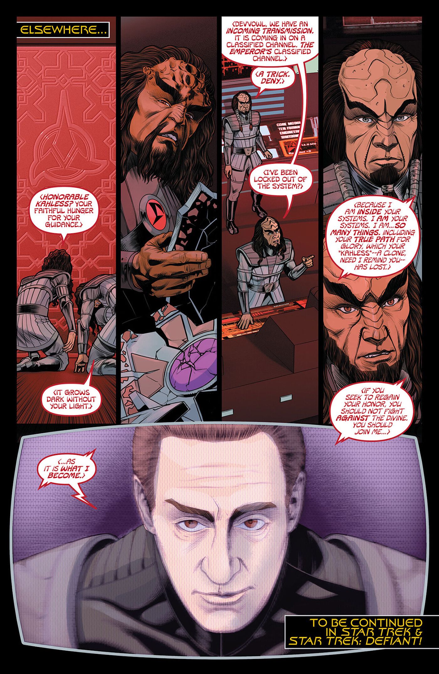 Star Trek El número 12 está escrito por Jackson Lanzing y Collin Kelly y dibujado por Angel Unzueta. El intento de golpe de Kahless ha sido sofocado y el canciller Martok está restableciendo el orden en el mundo natal de los klingon. Kahless huyó, acabando efectivamente con el movimiento. Varios cultistas del Camino Rojo, que seguían fanáticamente a Kahless, quedan a la deriva, desesperados por la aprobación de su mesías. Reciben una transmisión entrante de un barco en el canal del Emperador. Deciden no responder, pero la otra nave se hace cargo de sus sistemas. Se revela que es obra de Lore, quien les dice que, en lugar de luchar contra lo divino, deben unirse a él.