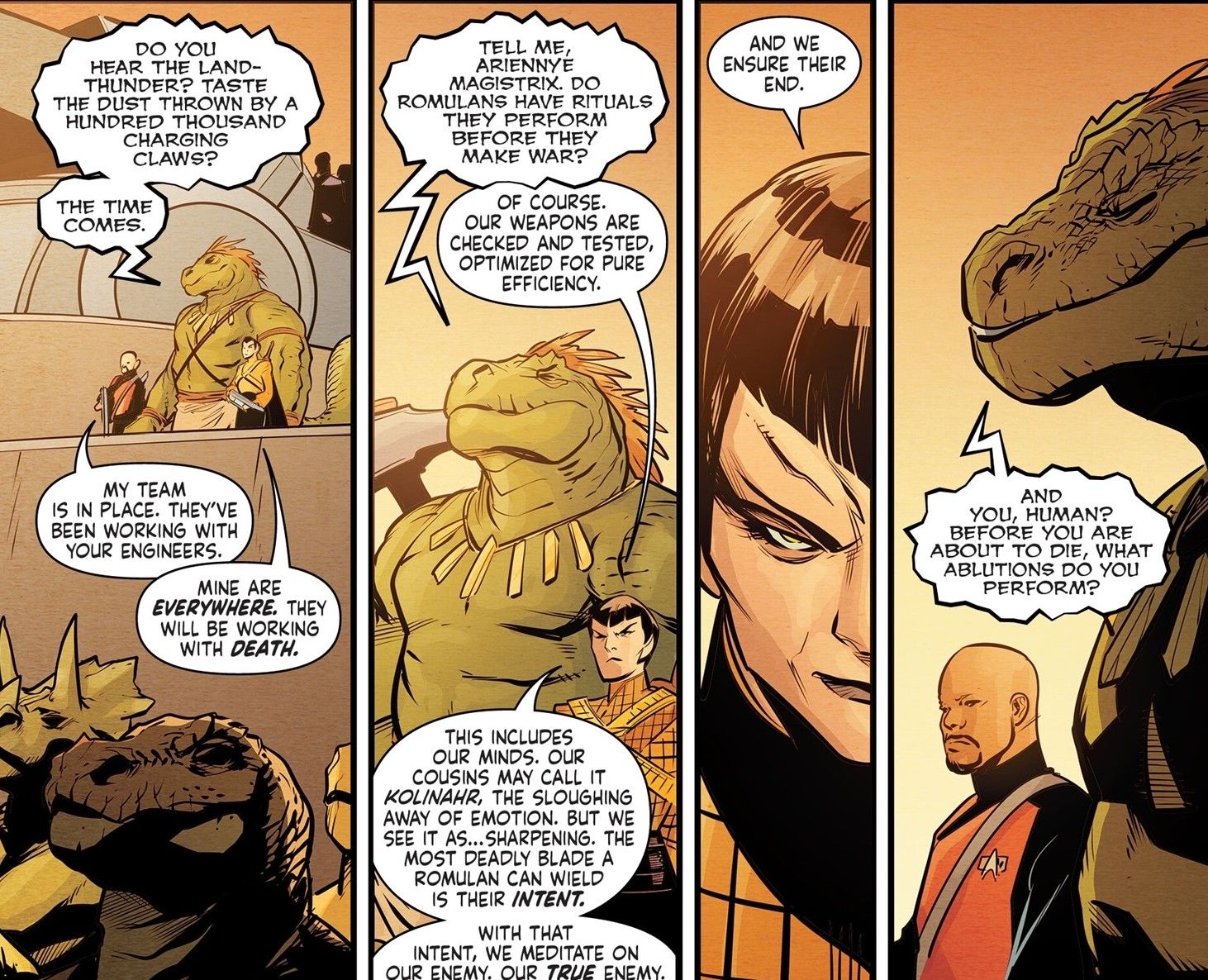 Star Trek El número 15 está escrito por Jackson Lanzing y Collin Kelly y dibujado por Marcus To. Los Tzenkethi le preguntan a Ariennye si tienen rituales anteriores a la guerra. Ella responde que sí: asegurándose de que sus armas sean probadas y optimizadas, y esto incluye sus mentes. Ariennye revela que practican una forma de Kolinahr que, en lugar de purgar las emociones, en realidad las agudiza. Ella le dice al representante de Tzenkethi que “la espada más mortífera que un romulano puede empuñar es su intención”.
