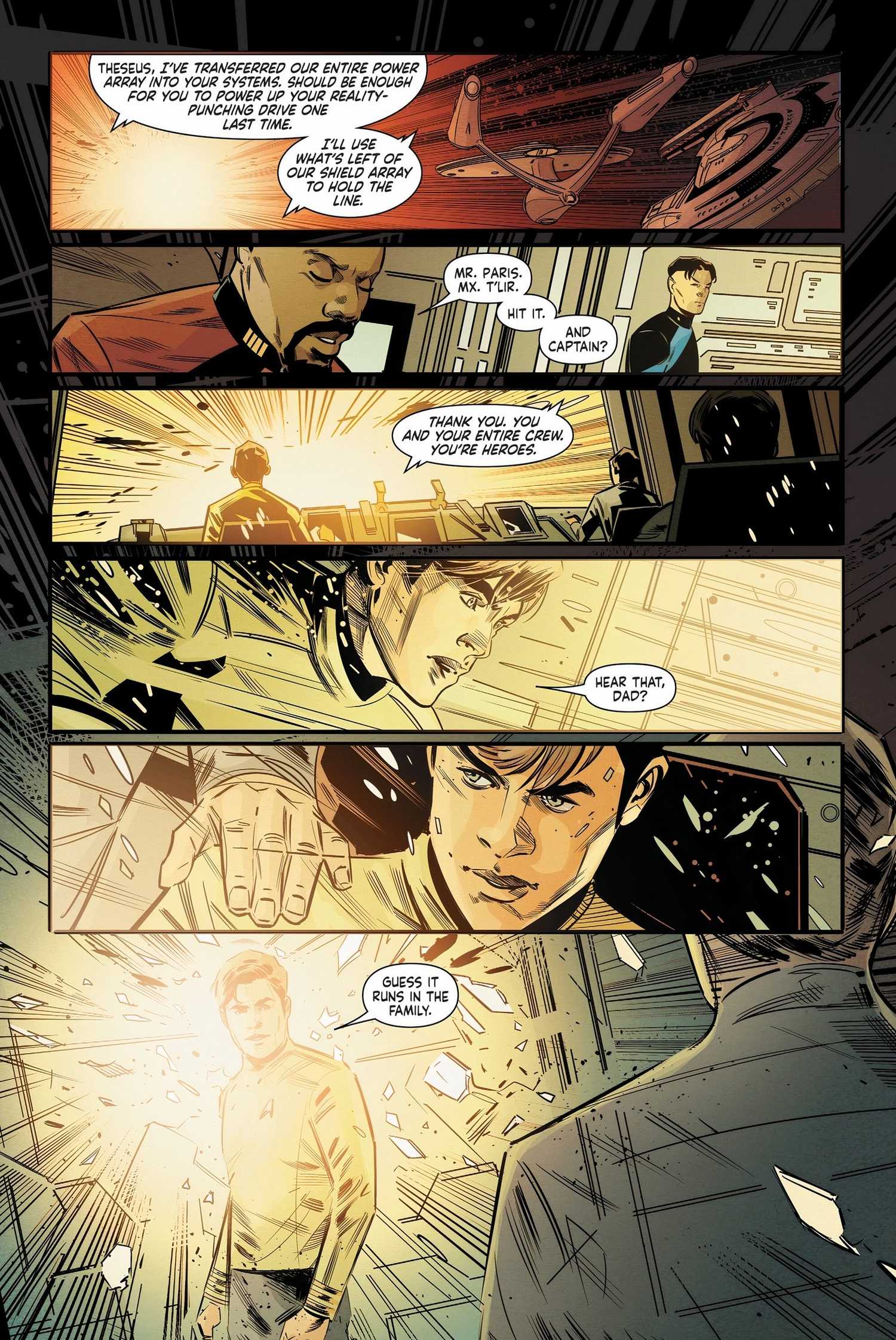 viaje a las estrellas El número 26 está escrito por Jackson Lanzing y Collin Kelly y dibujado por Angel Hernandez. A pesar de los esfuerzos tanto de Kelvin Empresa y el TeseoLa ola de destrucción de Lore los alcanza. A medida que el Universo Kelvin comienza a desaparecer, Kirk se ofrece a mantener la línea para permitir que el Teseo escapar. Sisko acepta a regañadientes y llama a Kirk y su tripulación “héroes”. Entonces se le aparece una visión del difunto padre de Kirk, y mientras El rostro del padre de Kirk está oscurecido, está claro que está orgulloso al darse cuenta de que su naturaleza heroica se contagió a su hijo.